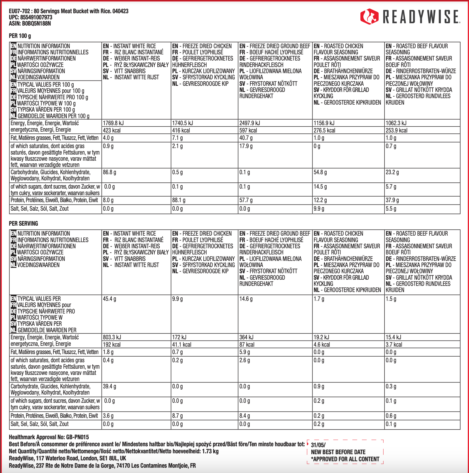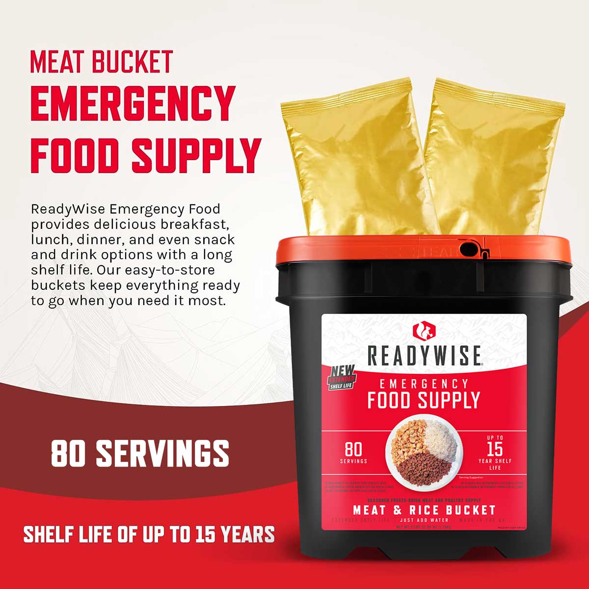Nuestro cubo de arroz y carne liofilizada de 80 porciones es un complemento perfecto para cualquier suministro de alimentos. Ya sea que se vea afectado por una tormenta de nieve, una inundación, cortes de electricidad, otras emergencias climáticas o simplemente desea preparar una comida fácil al aire libre o en casa, es aconsejable estar preparado. Estos gran- los alimentos liofilizados y deshidratados están listos en minutos con solo agregar agua. También vienen en cubos apilables con un fácil asa Grab-N-Go, para que sean fáciles de almacenar y transportar.