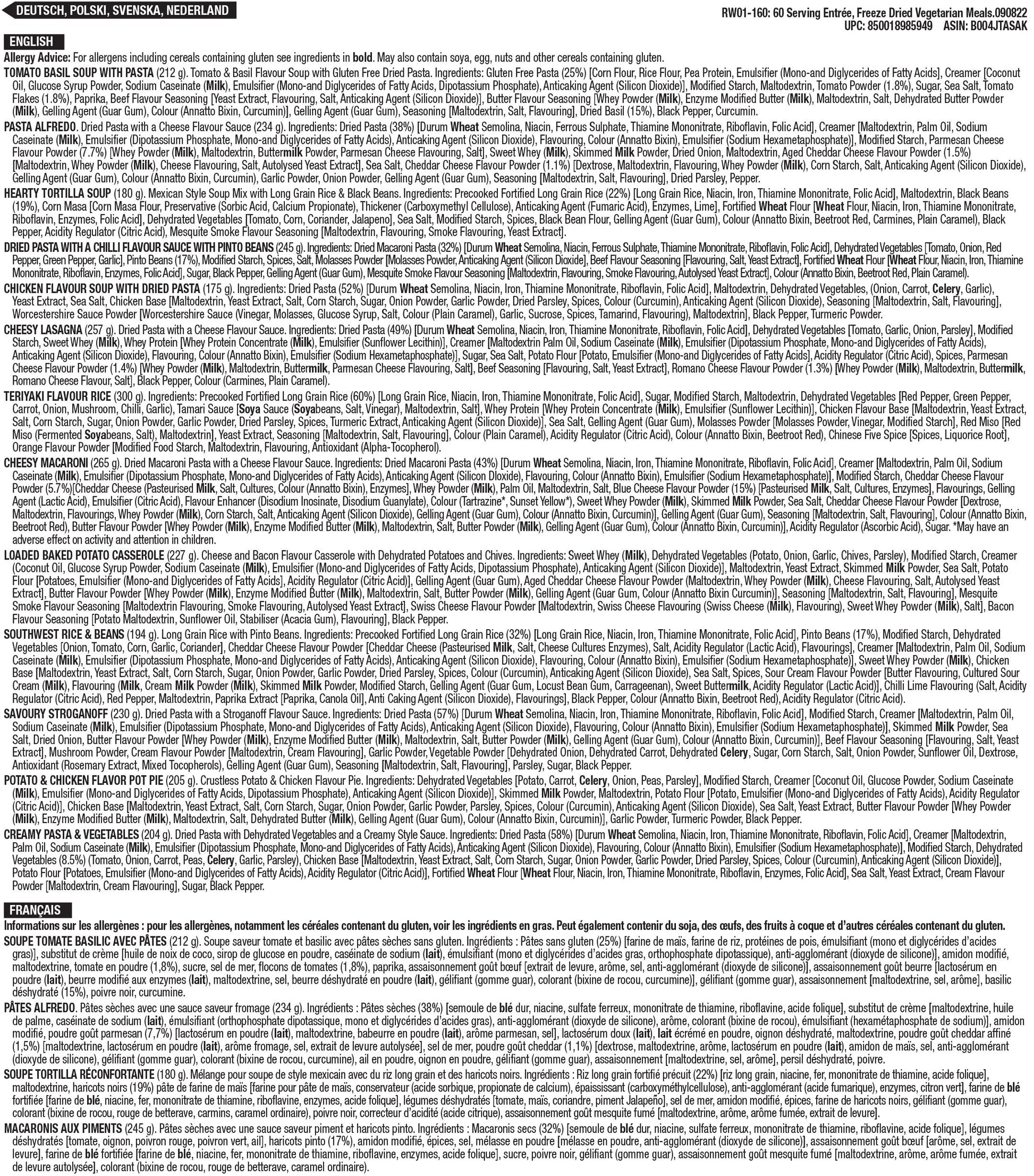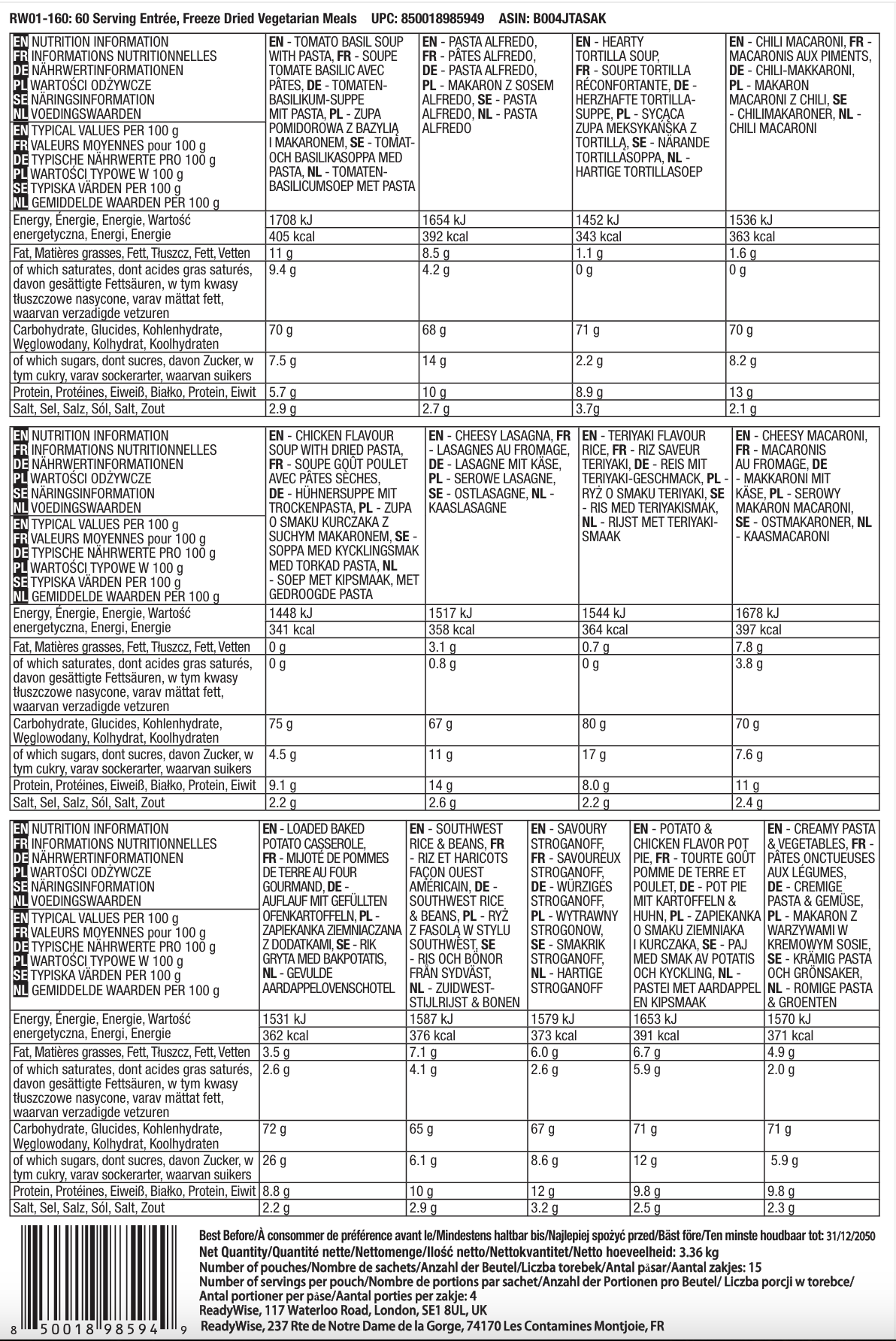 Plato principal de 60 porciones, comidas vegetarianas liofilizadas, hasta 25 años